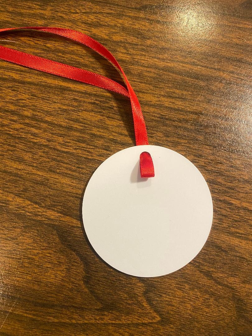 Round Two Sided White Gloss Sublimation Aluminum Holiday Christmas Ornament and red ribbon, 2.75" Round x .030". No peel coating.