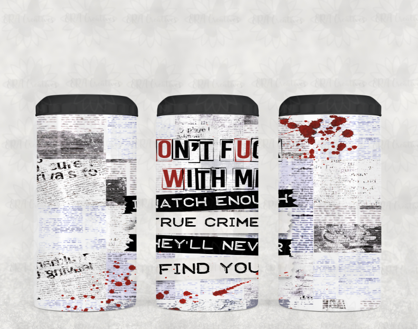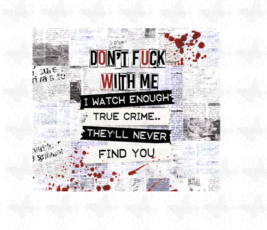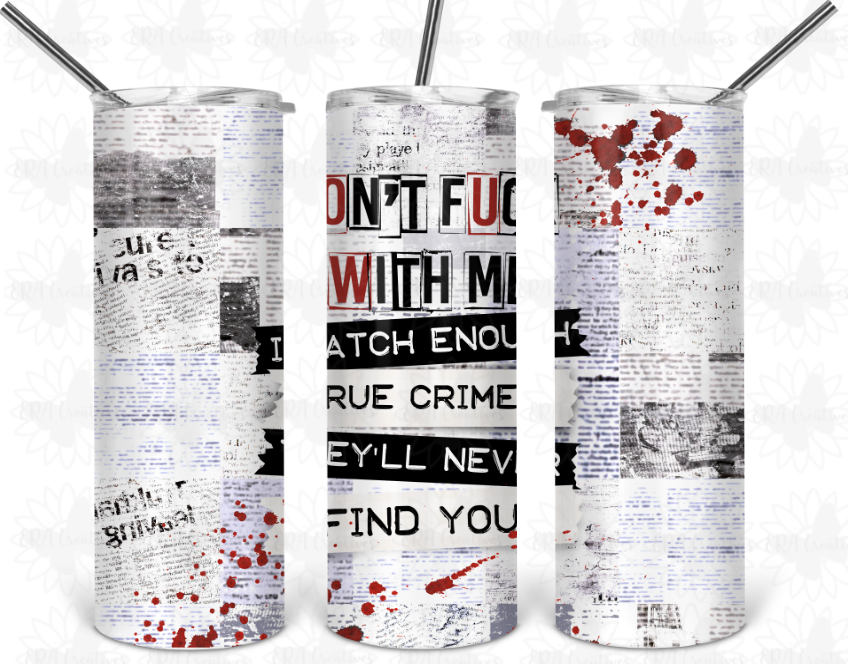 Stay hydrated in style with this stainless steel tumbler. Featuring "Don't Fuck with me I watch enough true crime they'll never find you" and Crime Shows artwork, it's the perfect way to express your love of true crime while you’re out and about. Keeping your drinks cold or hot for hours, this tumbler is a must-have for true crime fans.